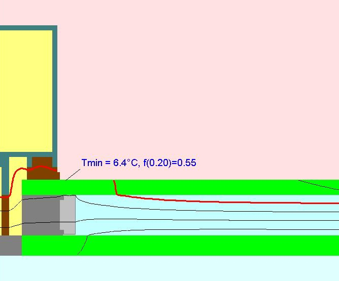 Für eine typische Systemanwendung wurde der nachstehende Ψ-Wert ermittelt, welcher alle Einflüsse durch Glasrand, Abstandhalter, Pfosten/Riegel-Profil und Wetterfuge berücksichtigt. Um den Einfluss der örtlichen Anker zu beurteilen wurden Chi-Werte ermittelt. Diese sind jedoch in Bezug auf den UCW-Wert vernachlässigbar.