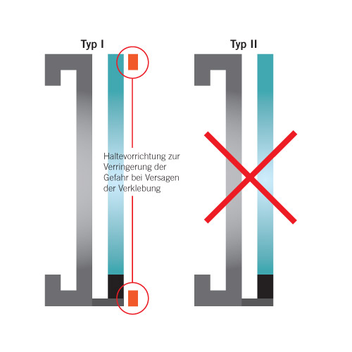 - Haltevorrichtungen (Nothalter) zur Verringerung der Gefahr bei Versagen der Verklebung sind in jedem Fall vorzusehen – ungeachtet der Einbauhöhe. Der Typ II ist in Österreich nicht zugelassen